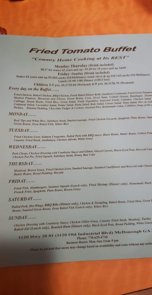 At Fried Tomato Buffet, located at 1120 Old Industrial Blvd in McDonough, GA, diners are treated to a delightful array of true southern home cooking. The buffet shines with hearty favorites such as perfectly fried chicken, flavorful chicken and dumplings, and some of the best fried tomatoes you’ll ever taste. Guests rave about the freshly made sides that evoke warm memories, like the nostalgic cole slaw reminiscent of grandma’s recipe.